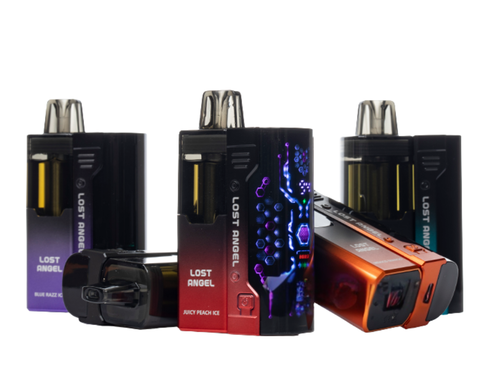 The Lost Angel MATE 50K Kit offers 50,000 puffs, equipped with a 1200mAh rechargeable battery, a smart 3D display, pod switching capability, and a leak-resistant design.